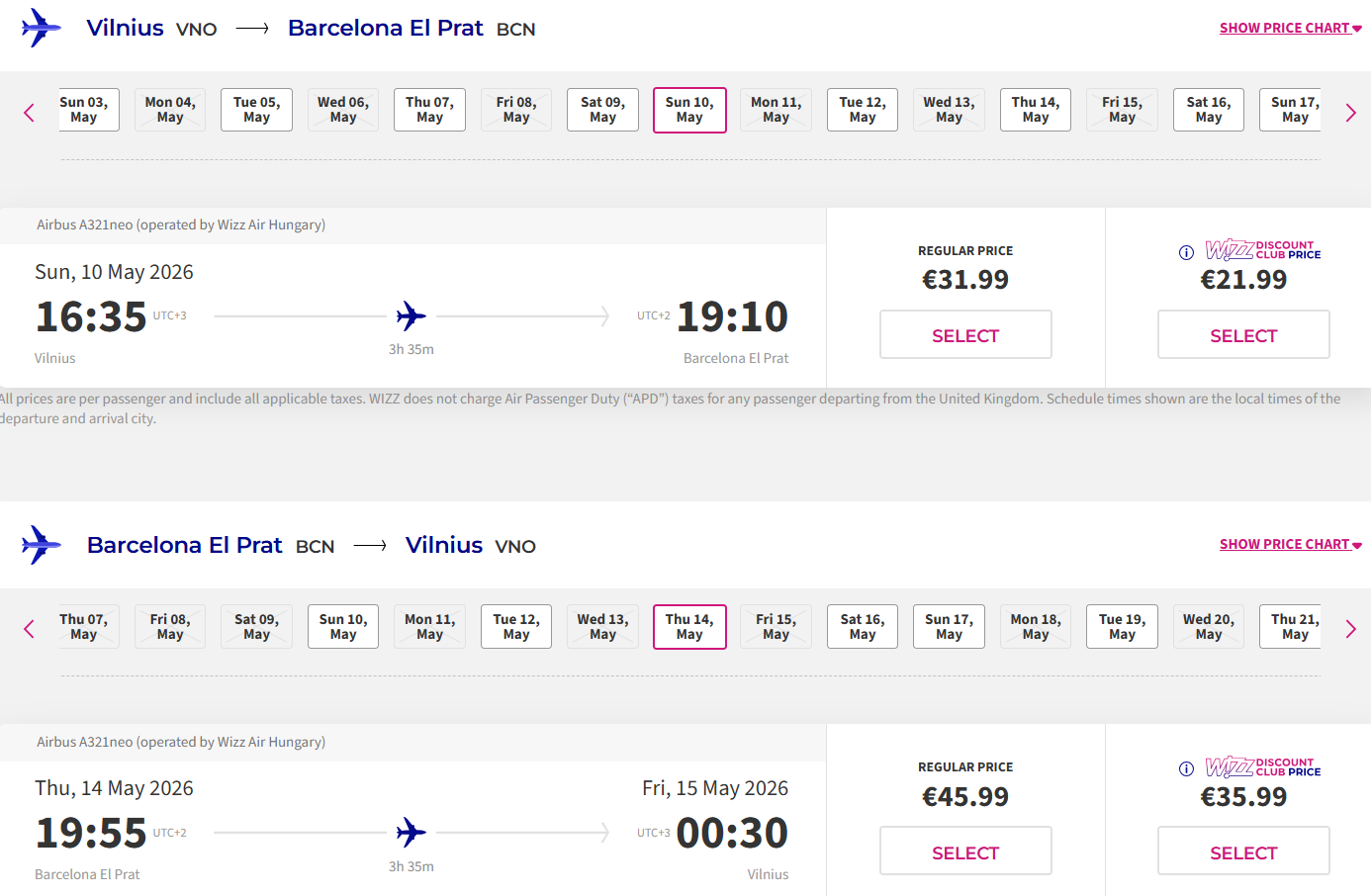 *Pigiausi skrydžiai su Wizzair lojalumo naryste! Neturintiems narystės, skrydžiai pabrangsta ~20 eurų.