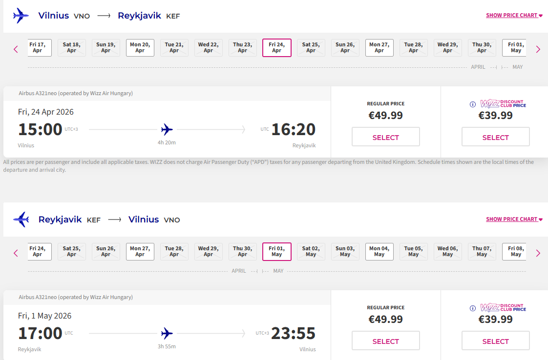 *Pigiausi skrydžiai su Wizzair lojalumo naryste! Neturintiems narystės, skrydžiai pabrangsta ~20 eurų.