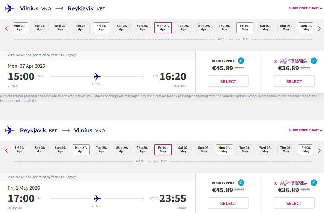 *Pigiausi skrydžiai su Wizzair lojalumo naryste! Neturintiems narystės, skrydžiai pabrangsta ~20 eurų.