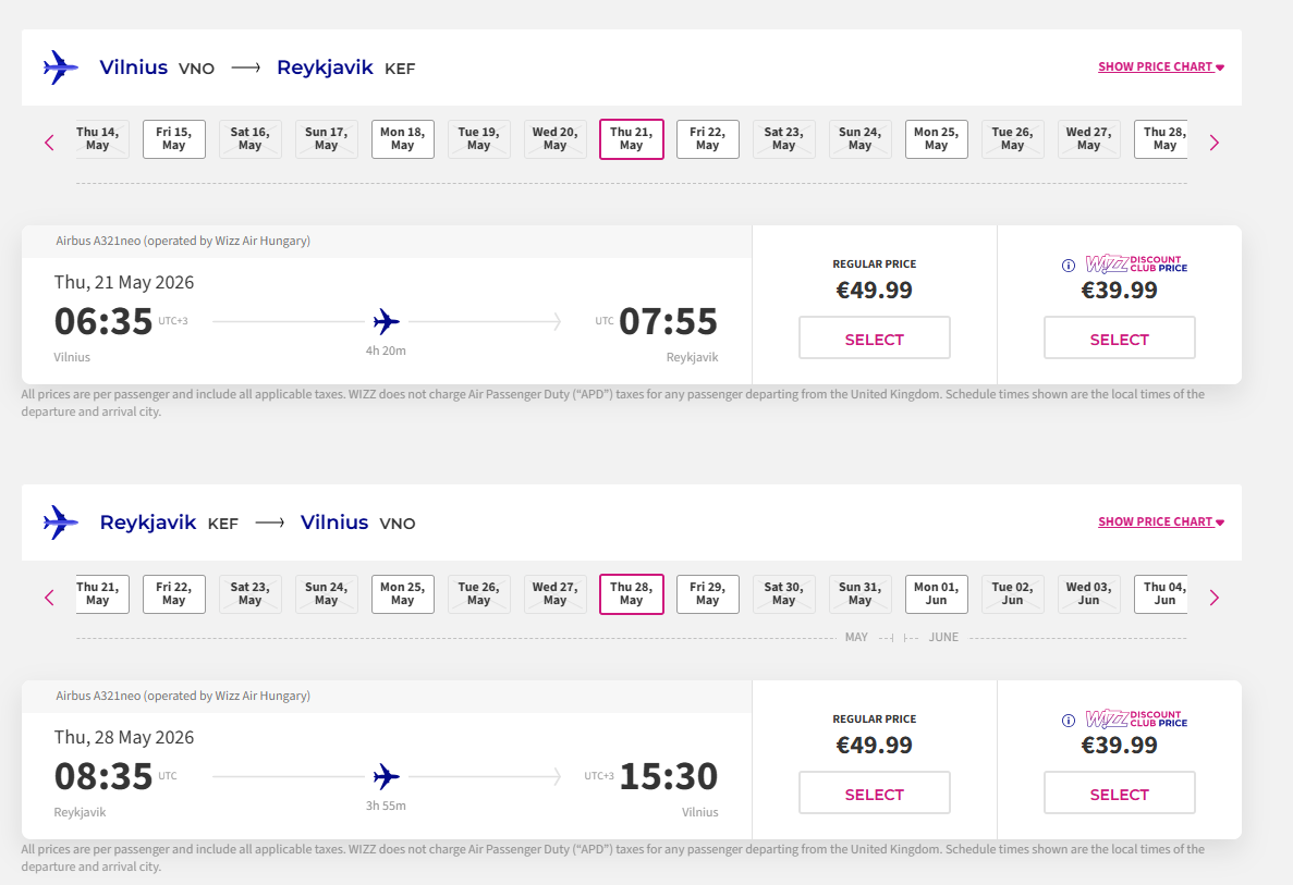 *Pigiausi skrydžiai su Wizzair lojalumo naryste! Neturintiems narystės, skrydžiai pabrangsta ~20 eurų.