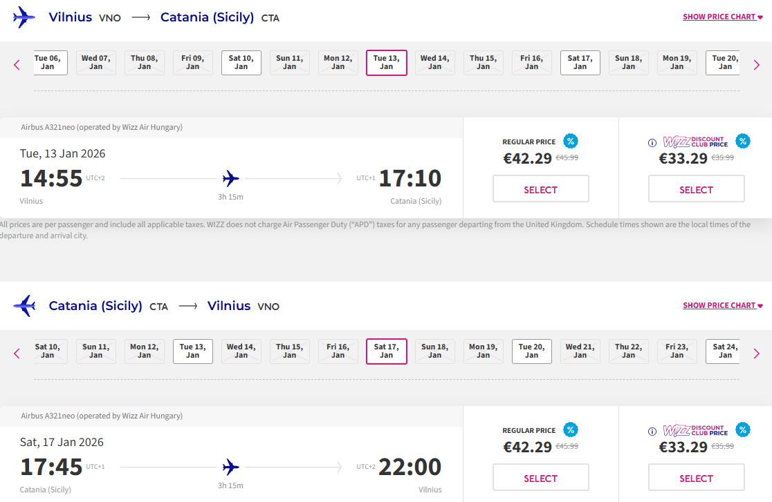 *Pigiausi skrydžiai su Wizzair lojalumo naryste! Neturintiems narystės, skrydžiai pabrangsta ~20 eurų.